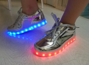 Striking sneakers with LED lighting are not only fashionable, but also practical: in the dark they act as reflectors, ensuring the safety of the pedestrian. They cannot be washed in a typewriter because of the batteries and microcircuits, which will not withstand direct contact with water.