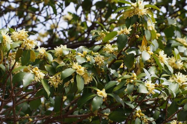 In the photo, star anise looks like a tree or a large shrub up to 18 m tall, in diameter it can reach 12 m. The leaves of anise are dark green, dense and leathery, oval in shape, simple in structure. Flowers - white with a yellow or pinkish tinge, with a double perianth. The plant blooms from March to May.