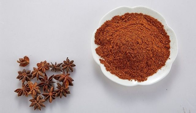 The finished seasoning is a coarse brown powder with a distinct red tint. Sometimes star anise can be found in the form of whole stars, which means that the fruits were dried right in the seed box.