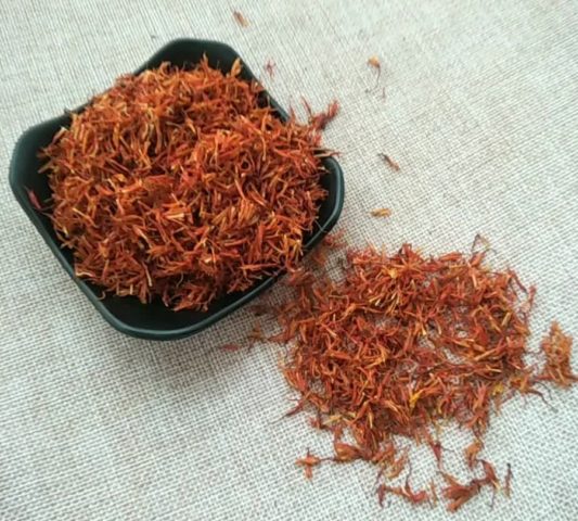 The collected raw materials are laid out for drying under a canopy or indoors with good ventilation. Direct rays of the sun should not fall on the petals. Dryers and ovens for processing raw materials should not be used, since even a slight increase in temperature can lead to the destruction of valuable substances in the composition. One of the harvesting methods suggests tying the collected dye safflower into small bunches and hanging them from the ceiling with the inflorescences down. In this case, the petals do not have to be constantly agitated for uniform drying.