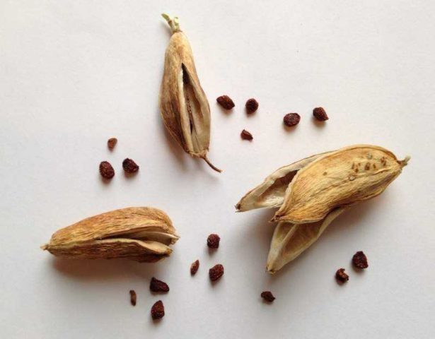The lifespan of each flower is up to six days. In its place, the development of the fetus takes place, which resembles a triangular box. It is filled with large seeds. Fruit ripening is observed in the second half of August.