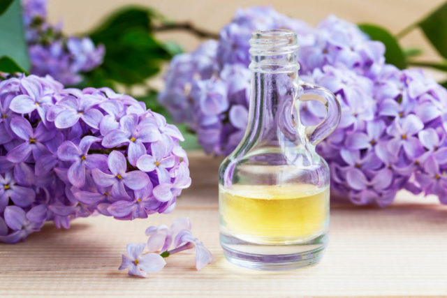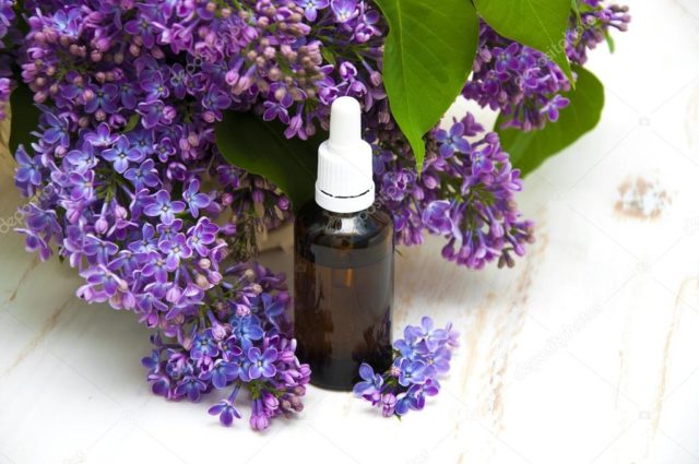 The chemical compounds present in the oil include lilac and terpene aldehydes. The aromatic agent prevents the development of depressive conditions and stomach diseases. Tincture of lilac in oil, made at home, removes fungus and bacteria, lowers the temperature. External application of the product smoothes wrinkles and increases skin turgor.