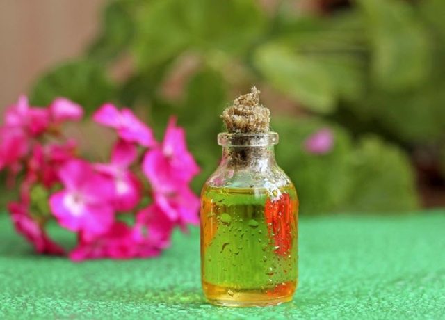 As a result of making geranium oil at home, you get a product with a yellowish color and a pleasant herbal aroma. In the treatment of ailments, the product will bring less benefit than a real pharmacy extract, but for cosmetic purposes and aromatherapy, its properties are very suitable.