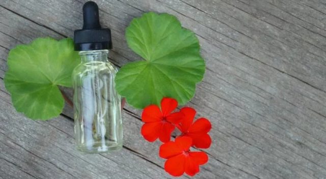 When treating burns, 5 drops of a geranium agent should be diluted in a large spoonful of olive base, and then moisten a cotton pad in an oily liquid and apply to the sore spot for 10 minutes.