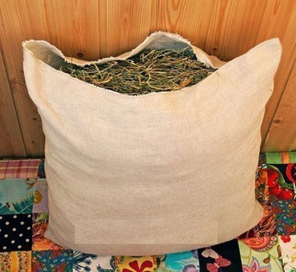 Usually small pillows are made, measuring 20 by 20 cm, of linen or cotton. They are stuffed with dried leaves and plant stems. In this case, it is advisable to use the grass grown in the last season in order to preserve its properties as long as possible. The service life of such a pillow is about two years, after which it should be refilled.