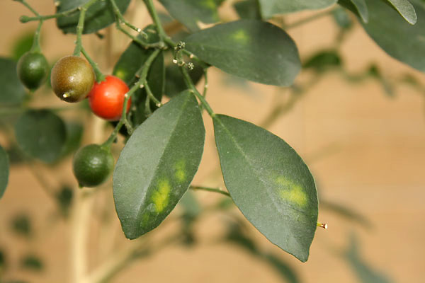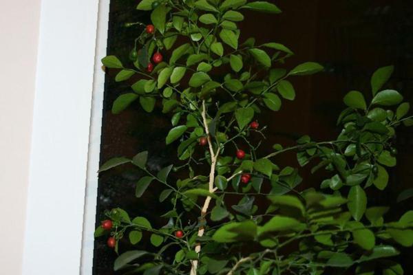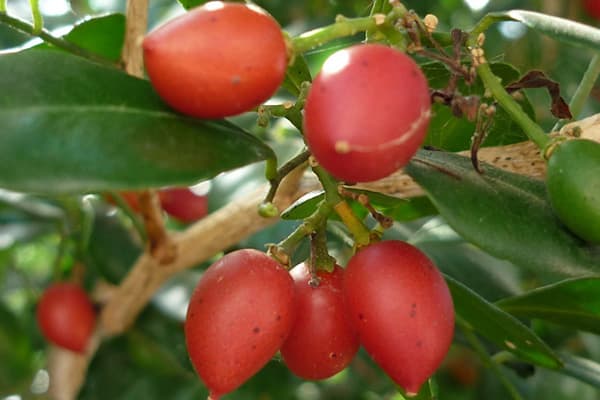 The branches resemble myrtle. Flowers are small, up to 2 cm in diameter, white, similar to jasmine. The plant exudes a pleasant, citrusy scent with notes of jasmine. Useful fruits ripen after and during flowering. At the beginning, the berries are orange, then turn red. The berries can be eaten. The fruit contains seeds and has a citrus scent.