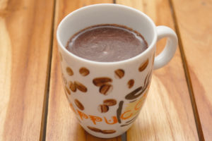 - Milk in a volume of 2 glasses is heated and 1.5 or 2 large spoons of dark carob are poured.
