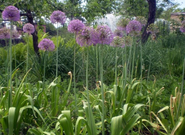 Leaves are wide and flat, in length they grow up to 40-50 cm. They are pubescent along the edges. During the flowering period, a dark green, flexible arrow up to 150 cm long is formed from the bulb. At the end, a spherical or hemispherical umbrella with a diameter of 10-15 cm is formed. The color of the flowers varies from dark lilac to pink-purple.