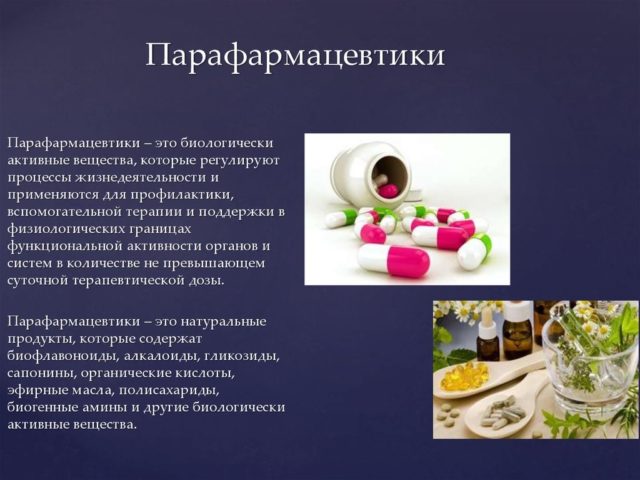 - Parapharmaceuticals... It is used for prophylaxis or as an adjunctive therapy to restore the body after injuries or diseases. They contain organic acids, bioflavonoids and caffeine.