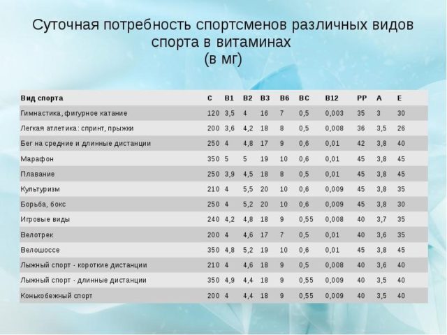 You can get useful substances from products. The diet of athletes should be varied. They need to eat 5-6 times a day. The daily calorie content of meals is 1600-2400. But food does not contain enough trace elements that a growing body needs. Therefore, it is recommended to give children special vitamin complexes.