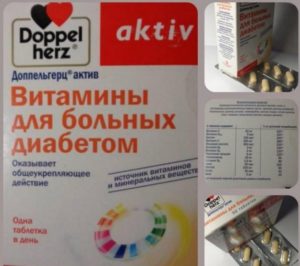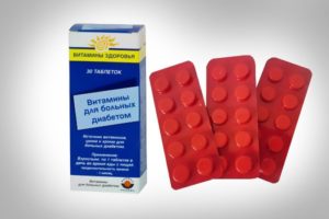 - Diabetiker vitamine (Germany). The medicine is not common in pharmacies, so it can only be purchased online. The package contains 30-60 tablets. The composition includes ascorbic and folic acid, B vitamins, tocopherol acetate, beta-keratin, zinc, chromium, biotin, nicotinamide. Suitable for both types of diabetes. Can be used as a prophylaxis. The drug optimizes glucose levels, normalizes blood pressure, lowers cholesterol and the risk of plaque formation. Vitamins are drunk one tablet for 30 days. A month - rest, then start the course again. Contraindications: thyroid hyperfunction, pregnancy, lactation, early age under 12, individual sensitivity.No side cases have been recorded, with an overdose of vitamins, allergic reactions are possible.