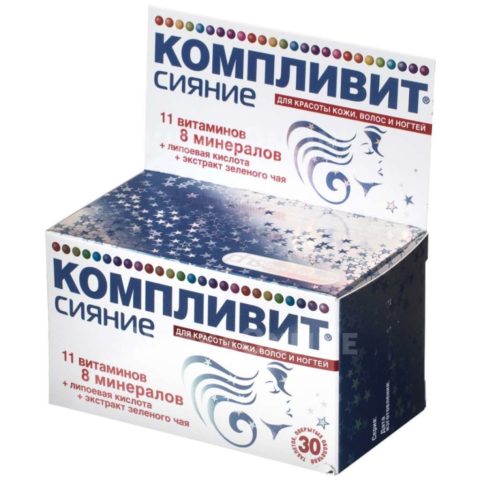 Complivit Radiance is rich in useful elements. In addition to them, biotin is present in the composition. The food supplement effectively removes fragility and strengthens the hair.