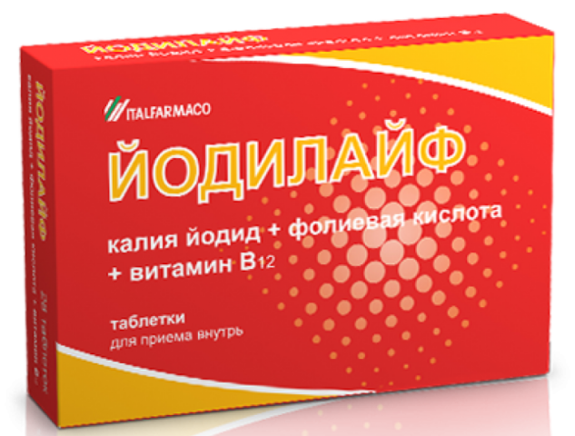 The active ingredient is potassium iodide + folic acid + ionocobalamin. Vitamin for pregnant women Yodilife is prescribed when there is a shortage of any substance that is part of the drug.