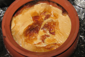 The oven is heated to 180 degrees and clay pots with milk are placed in it. After boiling, the temperature is reduced to 80 degrees and the foam is expected to form. Then the temperature is lowered by another 30 degrees and the milk is left to simmer for another seven hours.