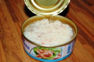 Canned crustaceans resemble finely chopped shrimp. The product is light, white-cream in color with a dense texture.