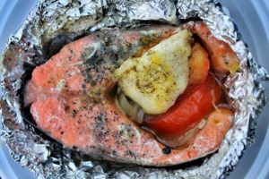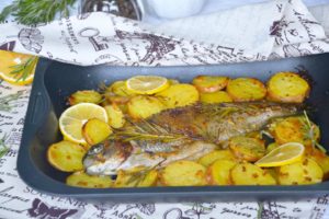 - On a greased baking sheet, spread tomatoes, potatoes, trout on top.