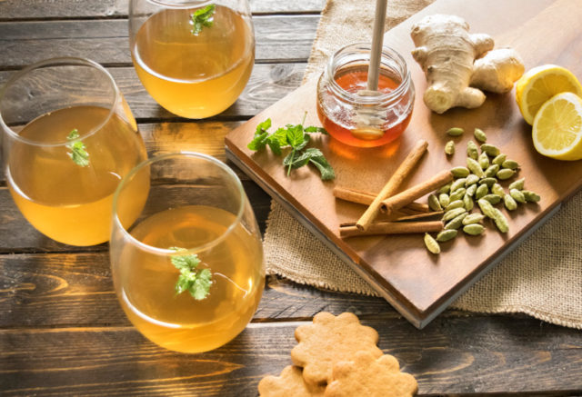 While the honey broth is being prepared, you need to pour a few black peppercorns, a couple of clove umbrellas, ground cinnamon and dry mint into a small saucepan, add 50 g of grated ginger root. The spices are boiled for 3 minutes, and then filtered into a sweet honey broth and 50 ml of fir extract is added. They drink hot fir sbiten with ginger, it is especially useful for the prevention and treatment of ARVI.