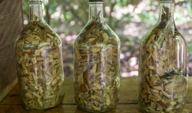 - a woody-herbal base, previously soaked in alcohol, is placed in a glass jar, and a sweet citrus mixture is added to it;