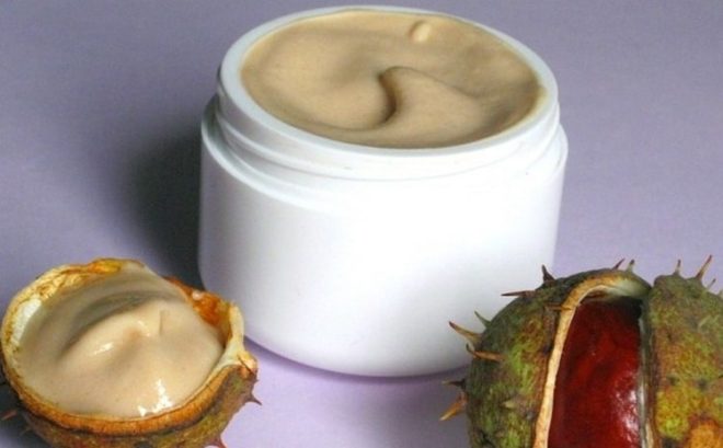 The ointment is prepared on the basis of the fruits or inflorescences of horse chestnut, because they contain an increased amount of healthy fatty oils. The raw material is crushed, vegetable or olive oil is added for structuring. Beat the mixture thoroughly until smooth.