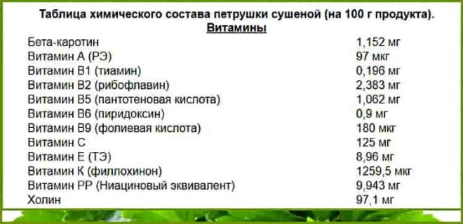 The calorie content of parsley (36 kcal per 100 grams) allows it to be used in the preparation of dietary meals. And the amount of minerals and vitamins allows the body to receive everything it needs during periods of recovery and lack of nutrients. The content of the elements is clearly shown in the table: