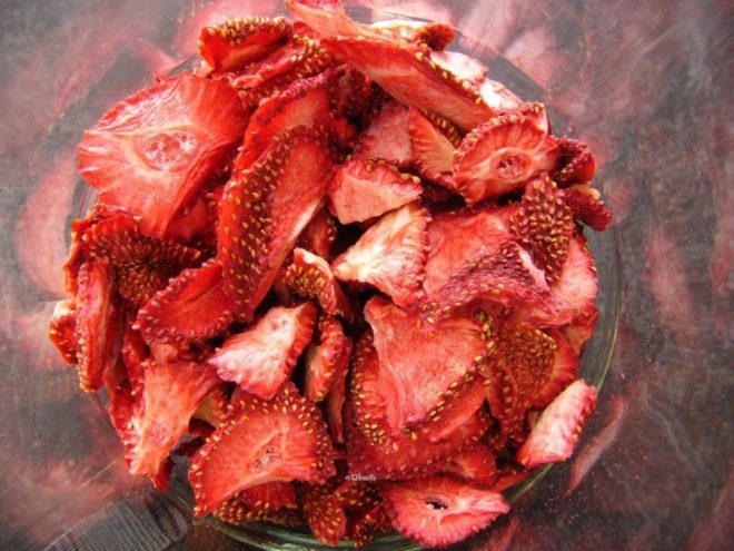 Dried strawberries preserve almost all the properties of fresh berries, since during drying, unlike freezing, most of the nutrients remain in them. The benefits of dried strawberries are that trace elements, sugars, folic and malic acids are kept at a level of 90-100%.