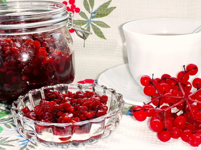 Viburnum jam is a sweetness suitable for any tea party. After processing the fruits, the benefits are not lost - the viburnum retains its vitamin composition. Therefore, it is recommended to use jam to prevent colds and to normalize bowel function.