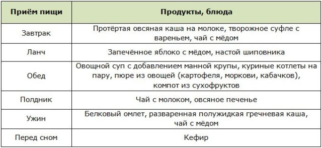 The diet is nutritious. It is rich in carbohydrates. At the same time, proteins and fats are included in a small amount. Food is steamed or boiled.