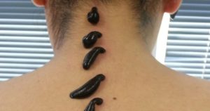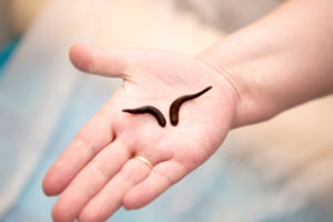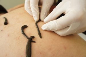 - using a syringe, the leech is directed to the skin at the injection site and covered with gauze as soon as the worm sucks;