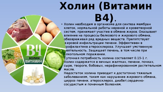 If you learn how to combine foods correctly, you will be able to quickly fill the lack of vitamin B4. Overdose should be avoided, although it is extremely rare.
