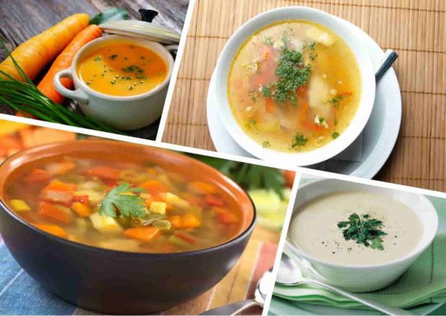 - chill, okroshka with the addition of yogurt, beetroot soup, nettle cabbage soup, vegetarian borscht, fruit, milk and lean soups (with rice, barley, potatoes, buckwheat, cauliflower, millet);