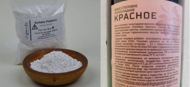We should also highlight the addition of a food additive to wine products. Drinks are produced using a special technology. Raw grapes must go through a fermentation process along with sugar. As a result, yeast appears. A quality drink will not work without them. In order to suspend this process in time, as well as to give the wine a richer taste, preservative E202 is added.