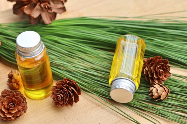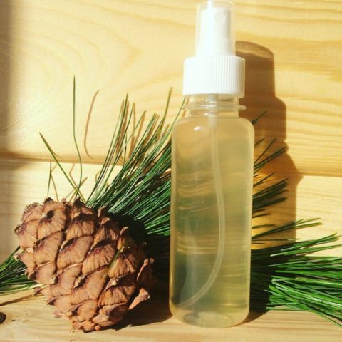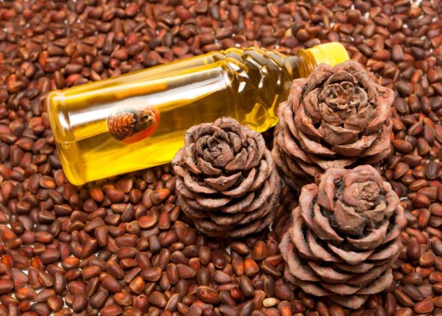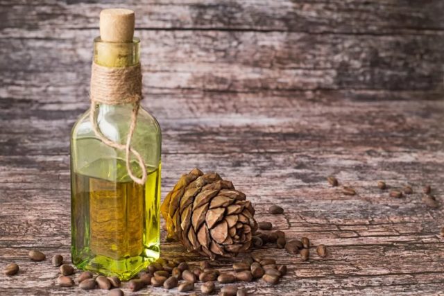The essential oil is obtained from pine nut kernels. The raw material is crushed and then subjected to a steam distillation procedure. As a result, a yellowish-brown viscous liquid with a woody aroma is released, which contains numerous useful substances.