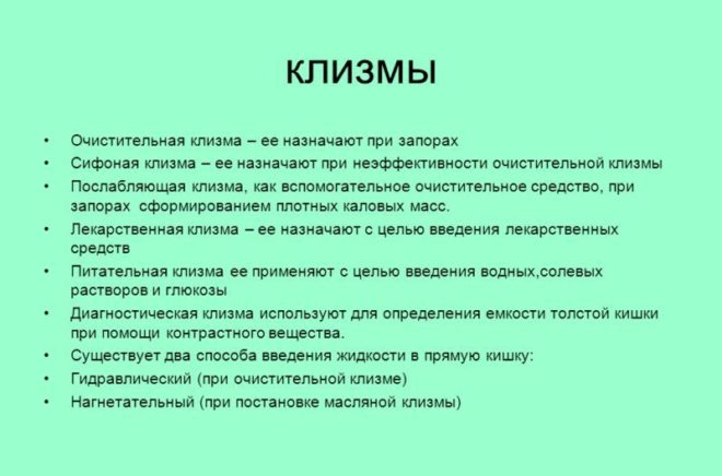 There are several types of enemas, allocated depending on their properties and purpose of use: