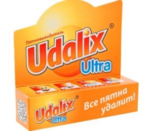 La droga se vende en forma de lápiz. Antes de lavar la zona, humedecerla con agua. Udalix se aplica con pinceladas sobre manchas de cereza de pájaro. Luego humedezca nuevamente y muela hasta que aparezca una espuma blanca fuerte.