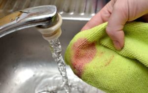 - Un trozo de tela que está contaminado con cereza de pájaro se sumerge en la solución y se mantiene hasta que la tela esté completamente limpia.