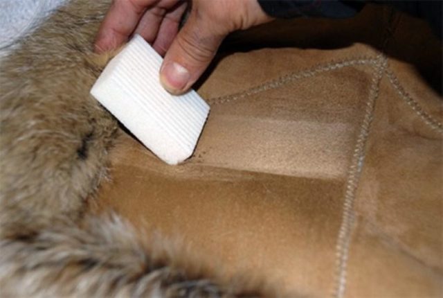 Puede limpiar en seco la cosa sin dañar el material. El ante, el nobuk y otros materiales naturales son bien tolerados por cepillos y productos domésticos ligeramente abrasivos. La superficie de la ropa no se deforma durante el procesamiento, el pelo se vuelve más suave después de la limpieza. El único inconveniente del método es que, en caso de contaminación grave, es posible que no produzca resultados.