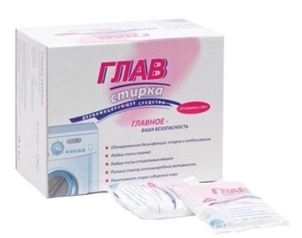 El detergente antibacteriano más popular entre los trabajadores médicos es el "lavado Glav" de producción rusa. No hay cloro en la composición, pero hay un desinfectante eficaz que destruye todos los microorganismos patógenos de la superficie del tejido. También elimina las manchas de sangre.