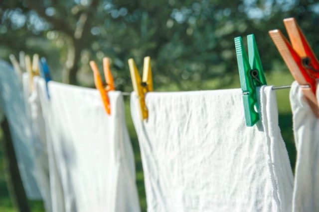 Los monos se secan en posición vertical, se fijan en un tendedero con pinzas para la ropa en la parte inferior o del cuello. Mejor cuando el producto está expuesto a la luz solar directa y en invierno, en el frío. El ultravioleta matará las bacterias restantes y la baja temperatura ayudará a blanquear mejor la bata.
