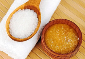 Para preparar la composición, debe agregar solo 1/2 cucharada de sal a una cucharadita de miel, mezclar bien y aplicar sobre la piel. El producto se frota con movimientos de masaje, esperar unos minutos y luego lavar la composición.
