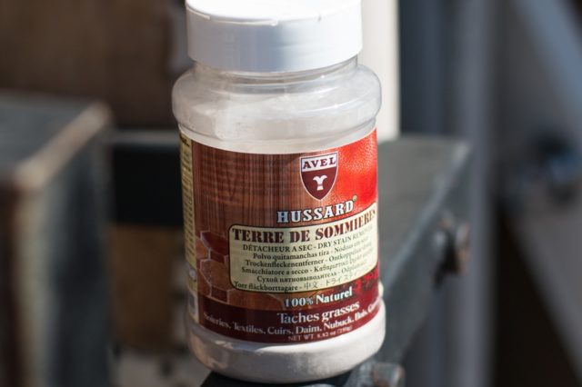 - Hussard Terre de Sommieres... El polvo de origen francés está diseñado para eliminar suavemente las manchas de cualquier ropa hecha de cuero, textiles, pieles, terciopelo y otros materiales. Es especialmente eficaz contra las manchas grasas y aceitosas. El polvo debe esparcirse sobre el área contaminada y dejarse durante varias horas, y luego eliminar con un cepillo.