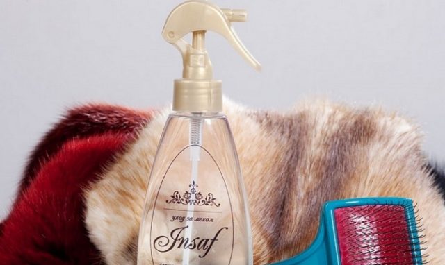 El spray Insaf elimina las manchas y protege el pelo de la suciedad nueva - Biofur... Este limpiador en aerosol natural es adecuado para la limpieza y el tratamiento profiláctico de la piel de conejo. El medicamento elimina eficazmente cualquier mancha: aceite, alimentos y bebidas, cosméticos decorativos. Con la ayuda de la herramienta, puede hacer frente a la amarillez y la grasa del cuello y los puños de un abrigo de piel. Use el producto de acuerdo con las instrucciones: rocíelo sobre el producto de piel y luego peine suavemente el pelo.