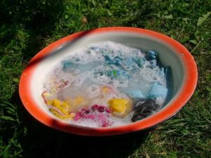 Aplicar la mezcla en la zona contaminada, frotar ligeramente. Deja que la ropa se seque un poco durante un tercio de hora. Luego enjuague con agua fría y lave de la forma habitual.
