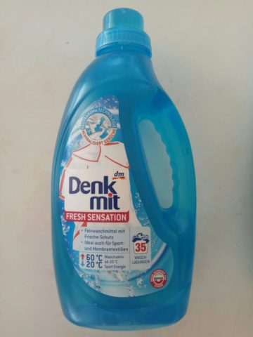 Gel Denkmit. Este producto de fabricantes alemanes está especialmente creado para lavar ropa de membrana. Contiene ingredientes activos que eliminan fácilmente la suciedad, los olores desagradables y las manchas, pero al mismo tiempo no violan la estructura porosa del material. La acción del gel se activa incluso a una temperatura del agua de +20 grados. Se puede utilizar tanto en lavadora como en modo manual.