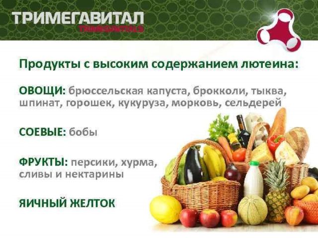 Para crear una dieta equilibrada, debe incluir frutas, verduras y huevos. Se ha establecido que los poseedores del récord de contenido de luteína son las verduras y frutas de colores verde oscuro, rojo y naranja.