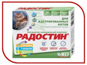 Vitaminas "Radostin“De una marca nacional son aptas para gatos esterilizados contra la caída del cabello.Los animales castrados también necesitan cuidados y alimentación especiales. La preparación contiene multivitamínicos, prebióticos. Las indicaciones de uso son problemas nutricionales, caída del cabello y medidas preventivas.