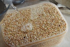- Vierta agua potable para que cubra 1 cm de trigo sarraceno.