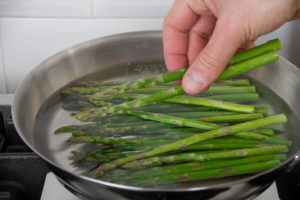 - poner un par de manojos de espárragos frescos cortados en una sartén y mezclar;