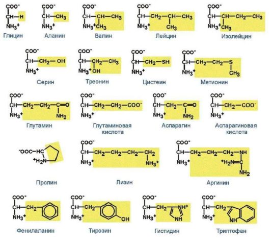 El cuerpo necesita todos los aminoácidos. Su efecto sobre el funcionamiento de órganos y sistemas no ha sido suficientemente estudiado. Se distinguen los siguientes grupos de sustancias: