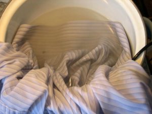 Le liquide doit être refroidi à température ambiante, traité avec une zone à problèmes et laissé tremper pendant 1 à 2 heures. Dès que cet intervalle de temps est écoulé, vous devez d'abord rincer les vêtements à l'eau courante, puis les laver avec du savon ou de la poudre et un revitalisant.