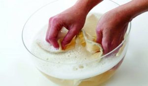 - dans la composition préparée, vous devez faire tremper la chose souillée pendant environ une demi-heure;